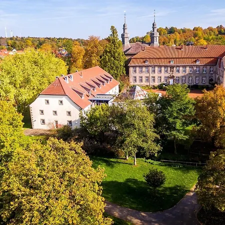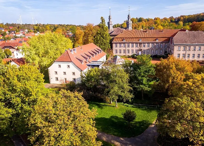 Wohlfuhlhotel Im Schlosspark - Self Checkin 维勒巴德森提供56间客房并配有游戏的场所 和花园. 距离维勒巴德森的市中心1公里,距离Hirschstein2.3公里.